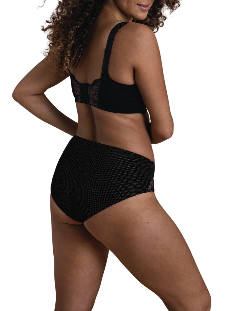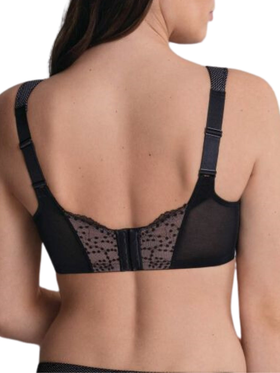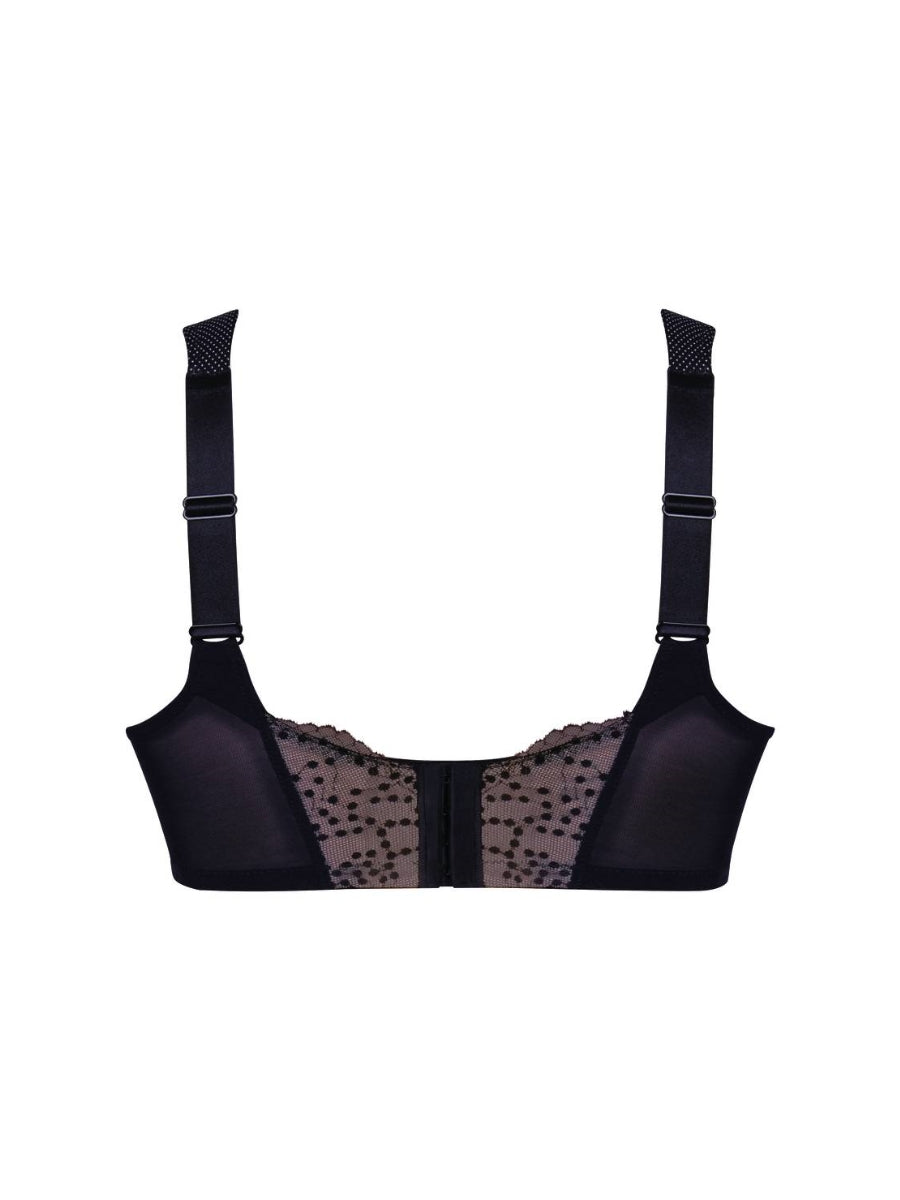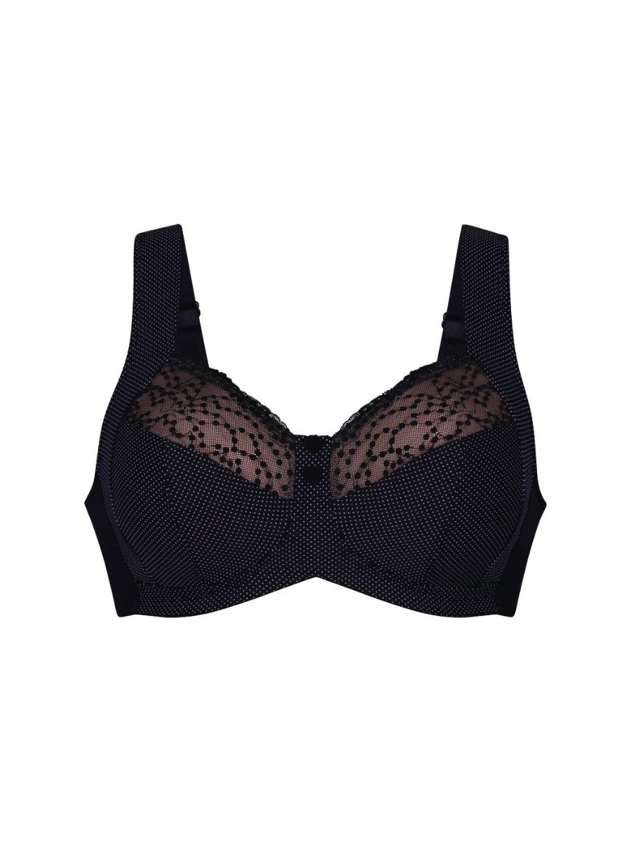 The Orely Support Soft Cup Bra by Anita offers luxurious comfort and support. With non-wired construction, polka dot embroidery, and delicate lace details, this bra is both functional and fashionable. The knitted fabric and gently arched front provide a comfortable fit, while the wide padded comfort straps relieve back and shoulder strain. Embrace elegance and comfort with this exclusive Black bra.